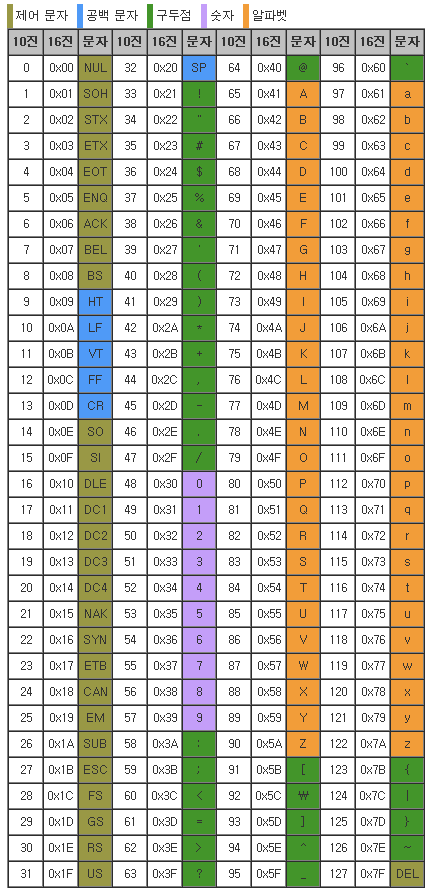 위 표를 보면 NUL, SOH, STX와 같은 문자들이 보이는데, 이런 코드들은 글자를 출력하는 데 쓰이지 않고 장치를 제어하기 위해 쓰이기 때문에 제어 문자(Control Character) 라고 불린다. (위 표에 보면 카키색으로 되어 있는 것들이 제어 문자)