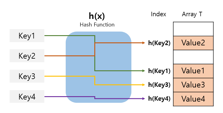 - 데이터를 key-value 로 저장 , 이때 key값이 배열의 인덱스로 변환되기 때문에 평균 시간복잡도가 O(1).