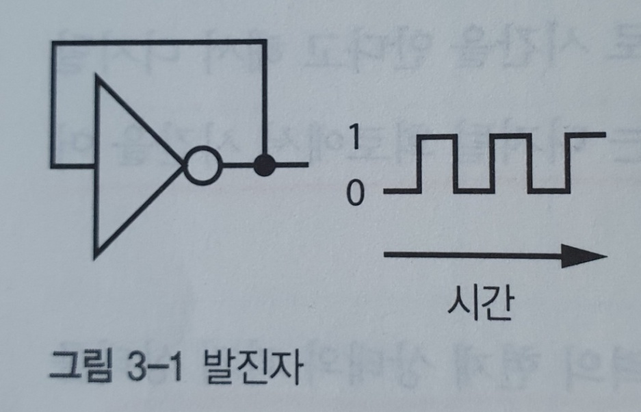 ์ด๋ฐ ์์ ์ฐ๊ฒฐ์ feedback ์ด๋ผ๊ณ ํ๋ค. ์ด๋ ๋ง์น ๋ง์ดํฌ์ ์คํผ์ปค๋ฅผ ๊ฐ๊น์ด ์์น์ํฌ ๋ ์๊ธฐ๋ ํ์๊ณผ ๊ฐ๋ค. ์ธ๋ฒํฐ ์ถ๋ ฅ์ ๋ค์ ์ธ๋ฒํฐ ์ ๋ ฅ์ผ๋ก ๋ค์ด๊ฐ๋ฉฐ, ์ด ์ ๋ ฅ์ ๋ค์ ์ถ๋ ฅ์ ๋ฐ์๋๋ค. ์ด๋ก ์ธํด ์ถ๋ ฅ์ด 0๊ณผ 1 ์ฌ์ด๋ฅผ ์ง๋ํ๋ค(oscillate). ์ด ๊ฐ์ด ์ง๋ํ๋ ์๋๋ ์ ํ์ง์ฐ์ ๋ฐ๋ผ ๊ฒฐ์ ๋๋ฉฐ, ์จ๋์ ๋ฐ๋ผ ๋ฌ๋ผ์ง๋ ๊ฒฝํฅ์ด ์๋ค. ์ข ๋ ์์ ์ ์ธ ์ฃผํ์๋ก ์ง๋ํ๋ ๋ฐ์ง์(oscillator)๊ฐ ์๋ค๋ฉด ๋ ์ ํํ ์๊ฐ์ ์ธก์ ํ ์ ์๋ ๊ธฐ์ค์ด ๋ ๊ฒ์ด๋ค.