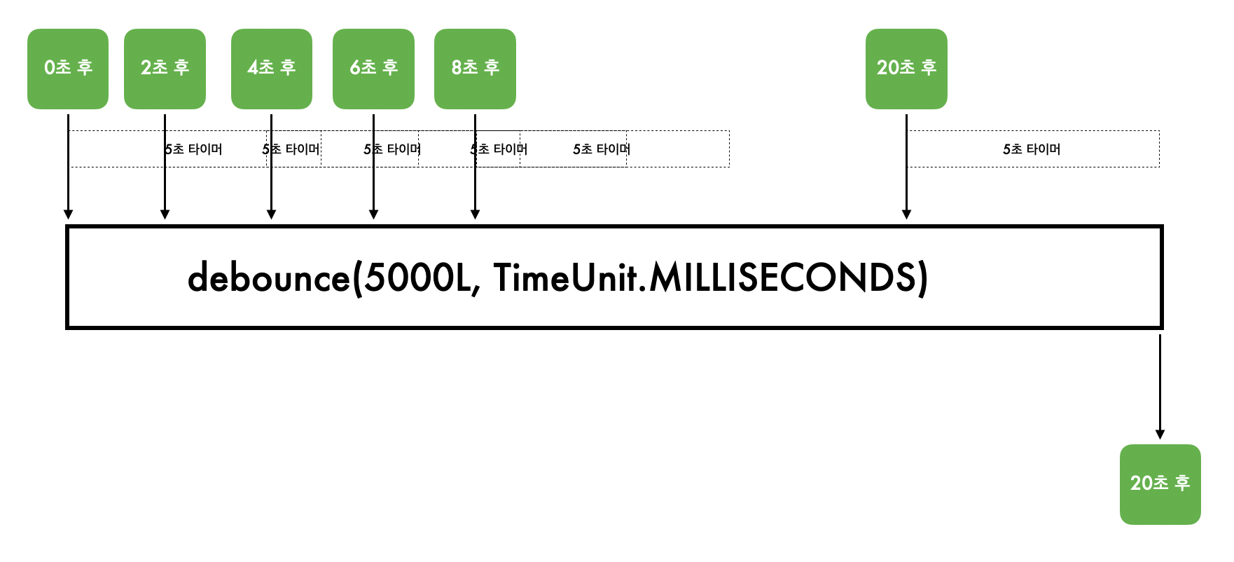 이벤트가 들어오는 간격은 2초이고, debounce 타이머는 5초이니 이벤트가 들어올 때마다 타이머가 계속 리셋되는 것!! (아래 그림 참고)