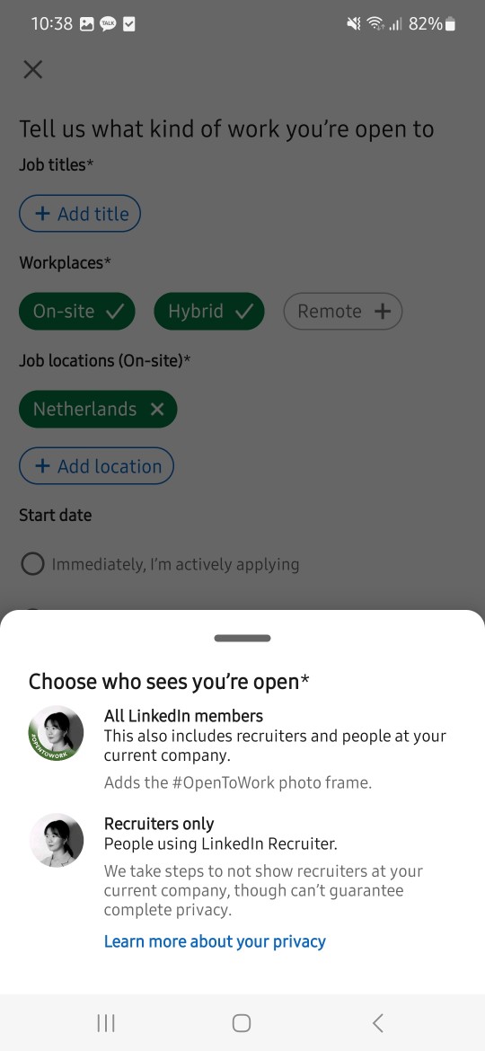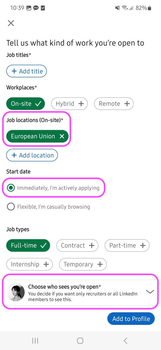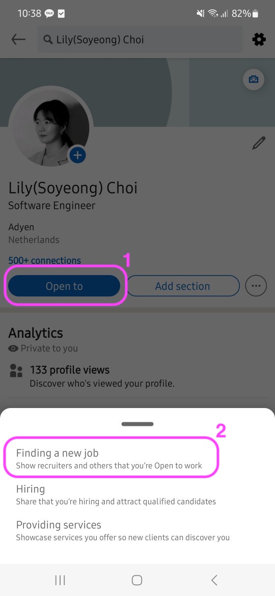 ๋ณธ์ธ ํ๋กํ ํ๋ฉด์์ ์์ ๊ฐ์ด ๊ตฌ์ง ์ค ์ค์ ์ ํ ์๊ฐ ์๋ค. ์ด์ ๋ ๋ชจ๋ฅด๊ฒ ๋๋ฐ, ์ด Open to ๋ฒํผ์ด ๋ฐ์คํฌํฑ ๋ฒ์ ์์๋ ์ ๋ณด์ด๊ณ ๋ชจ๋ฐ์ผ ๋ฒ์ ์์๋ง ๋ณด์ธ๋ค. (๋ฐ์คํฌํฑ ๋ฒ์ ์์ ์ด ๋ฒํผ ์ฐพ์ผ๋ ค๊ณ ํ์ฐธ ํค๋งค์๋๋ฐ..)